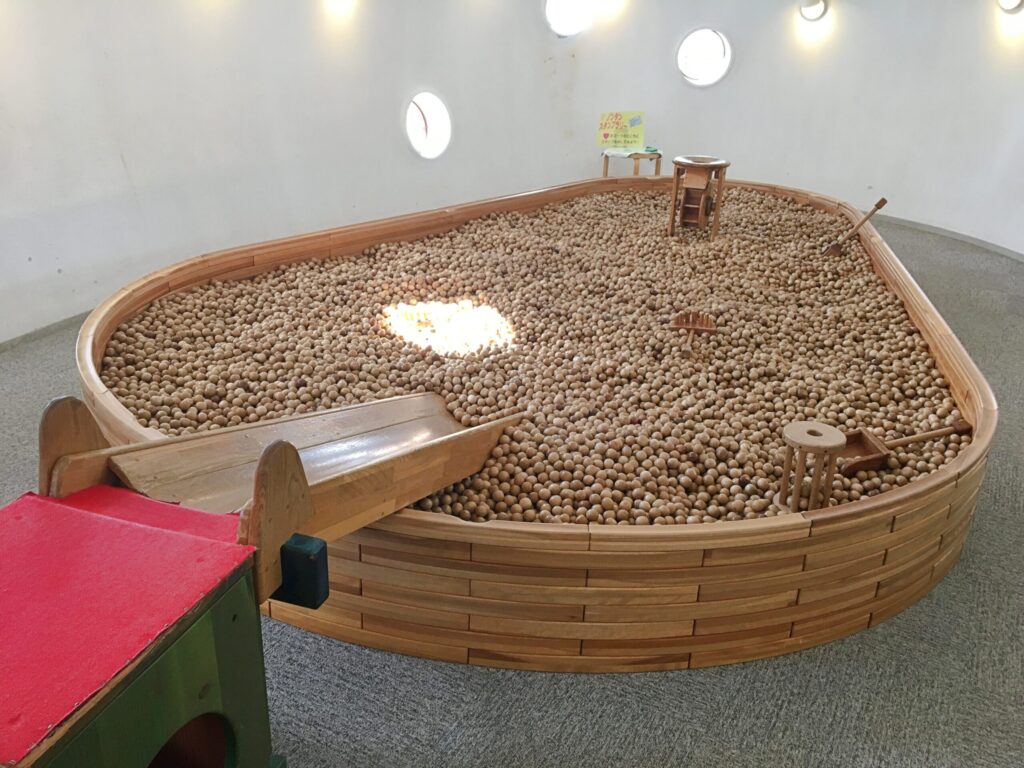 また、絵本だけではなく、小さい子供がおままごとを楽しめる「ごっこはうす」や約10万個の木の玉が入った大きな木の砂場もあります。