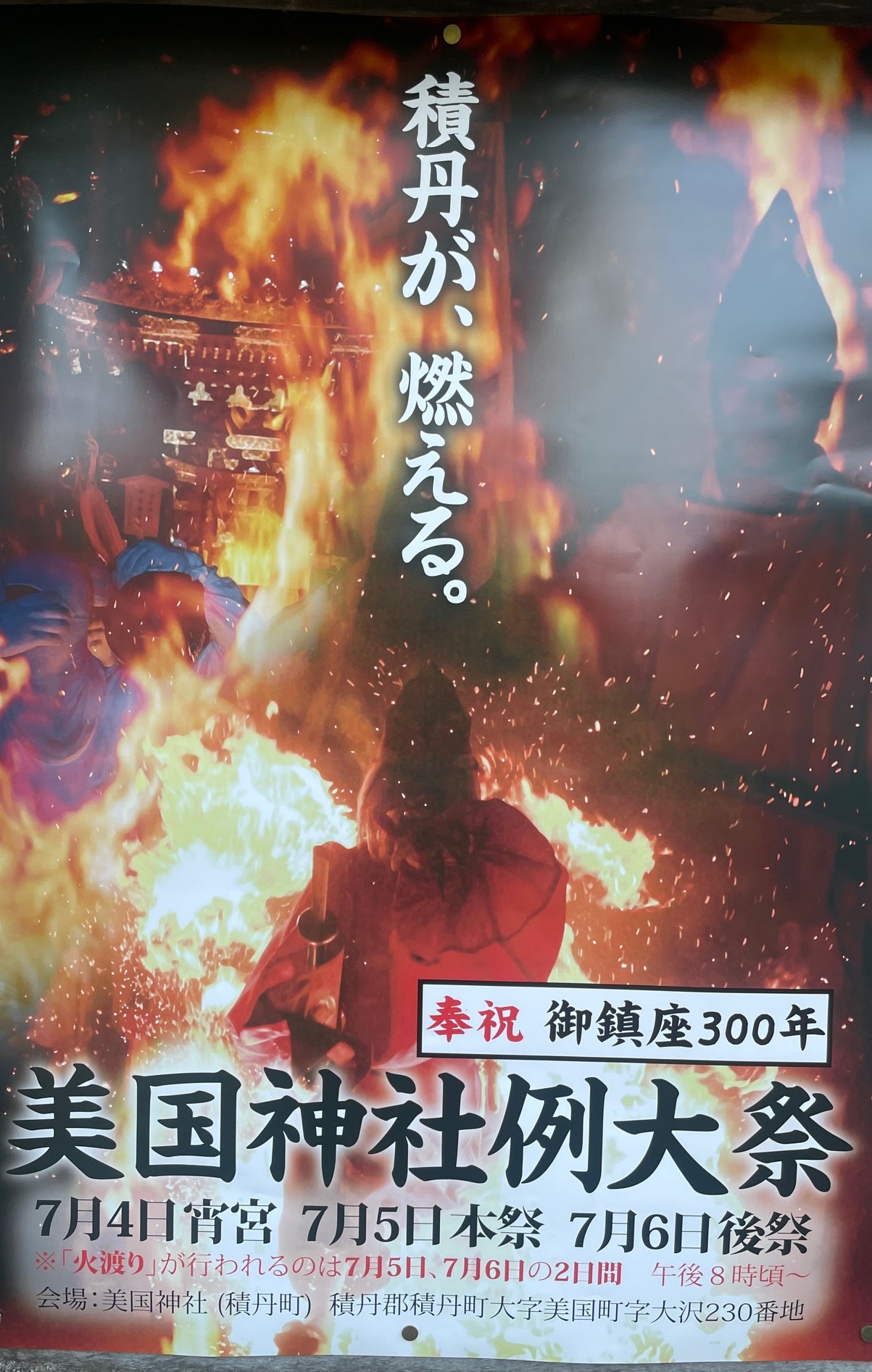 美国神社の例大祭の最大の見どころは、燃え盛る炎の上を天狗が歩いてわたる「天狗の火渡り」です。火渡りは5日と6日の夜の2日間で行われ、地域を歩いて回った天狗が、体に集めた穢れや罪、厄災を火で燃やし清める神事となっています。一本足の下駄を履いた天狗が炎の上を歩くと、一気に火の粉が舞い上がり、幻想的で迫力のある光景に周囲の観客から大きな歓声が上がります。