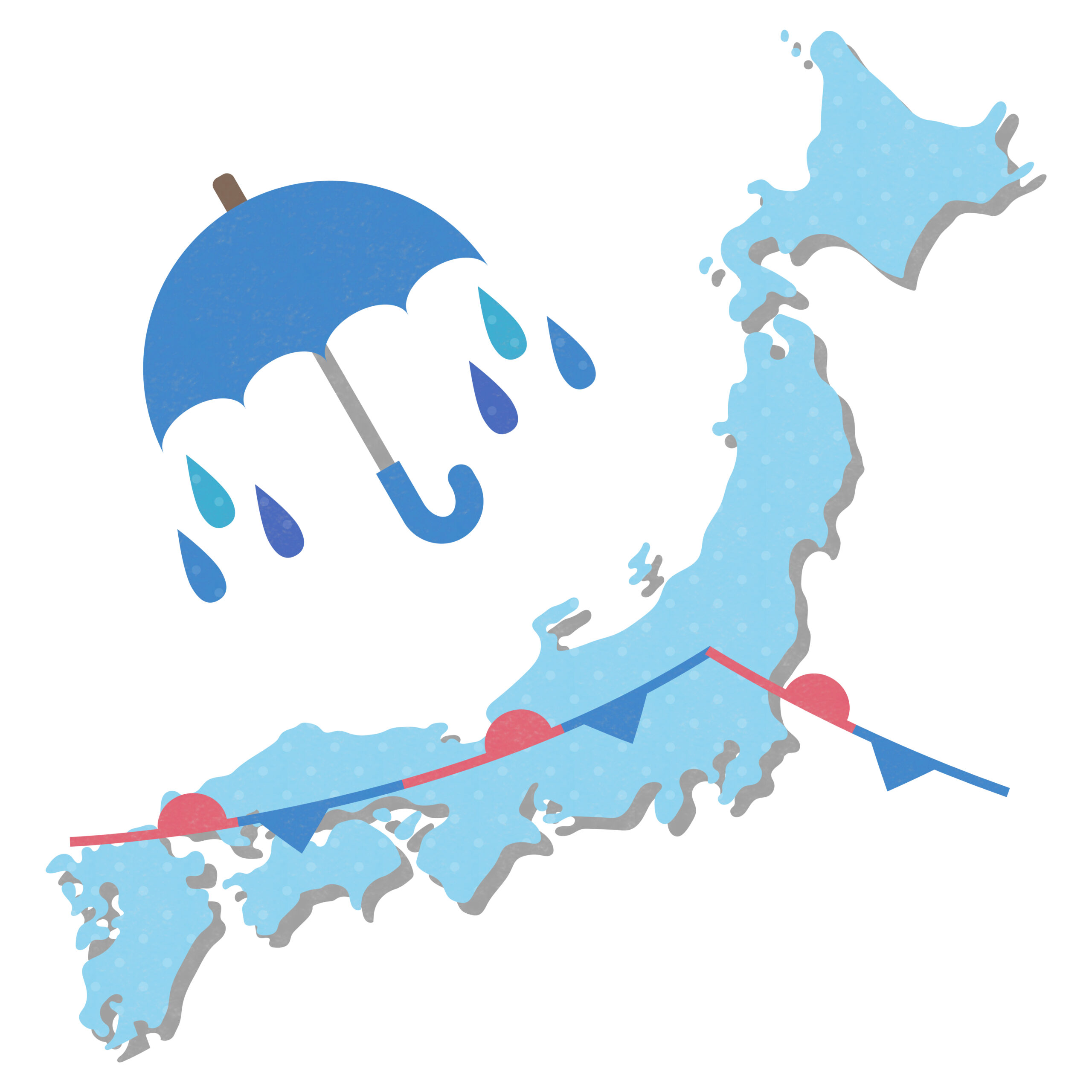 梅雨前線は季節の変わり目に春の冷たい空気と夏の湿った暑い空気がぶつかりあって起こり、日本を北上しながら雨を降らせて、大抵は北海道に到着する前に消滅します。しかし、近年では梅雨前線が津軽海峡を越え、北海道まで持ち越される年も増えてきていて、その場合、道南などの本州に近い地域は7月頃に雨が多くなります。ただ、梅雨前線がオホーツク海側までやってくることはほとんどないため、道内でもオホーツク海側は梅雨の影響を受けにくい地域となっています。