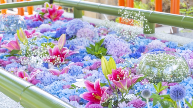 近年では手水舎を花で飾る花手水がとても綺麗な神社として知られるほか、境内に並ぶ朱色の鳥居が美しく、写真映えスポットとしても人気です。