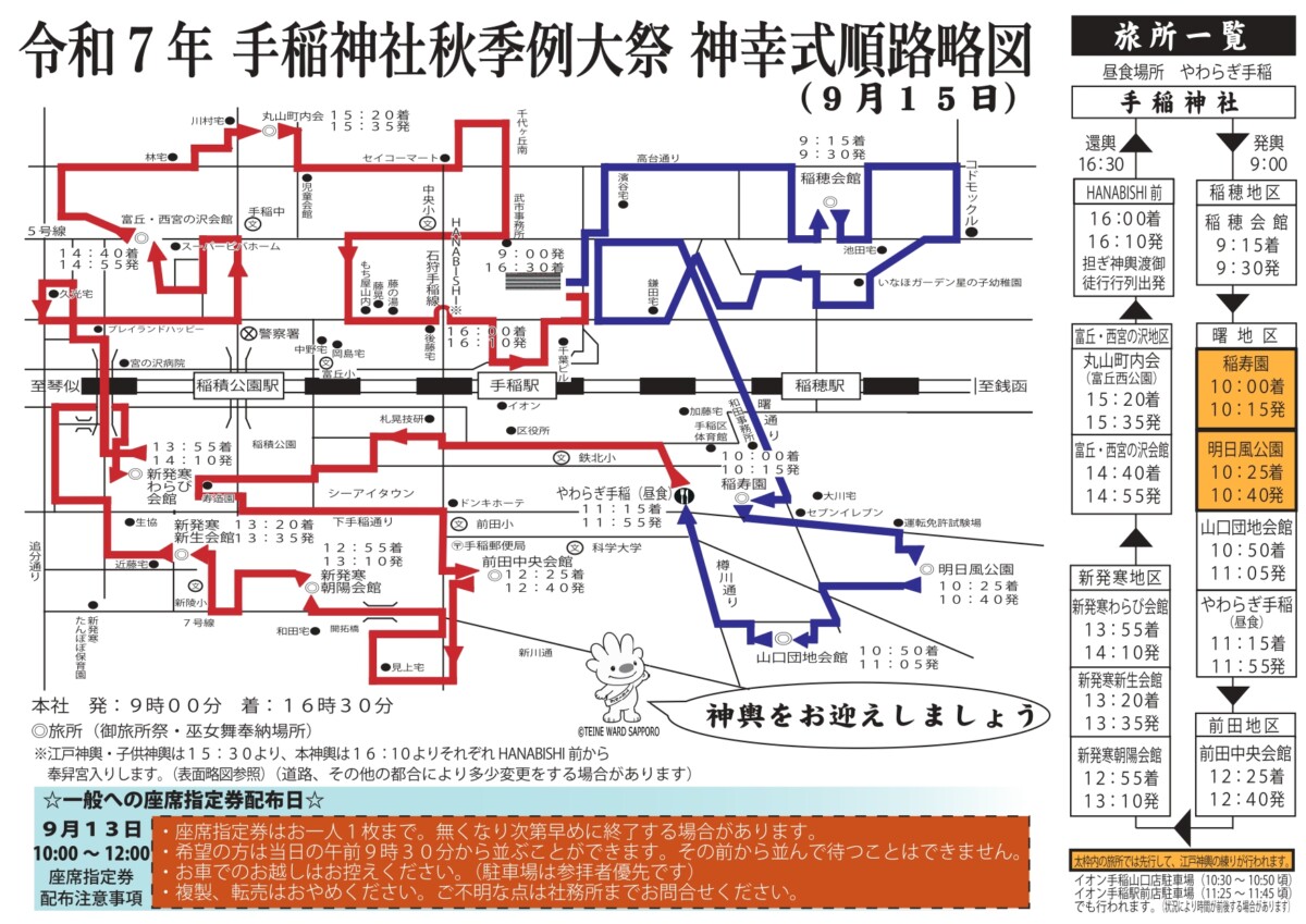 手稲神社の例祭では、15日に神輿渡御が行われます。午前9時に発輿・車両渡御出発、午後3時半から手稲神社江戸神輿、午後4時過ぎから本神輿走行渡御が予定されています。順路は下の画像をご確認ください。