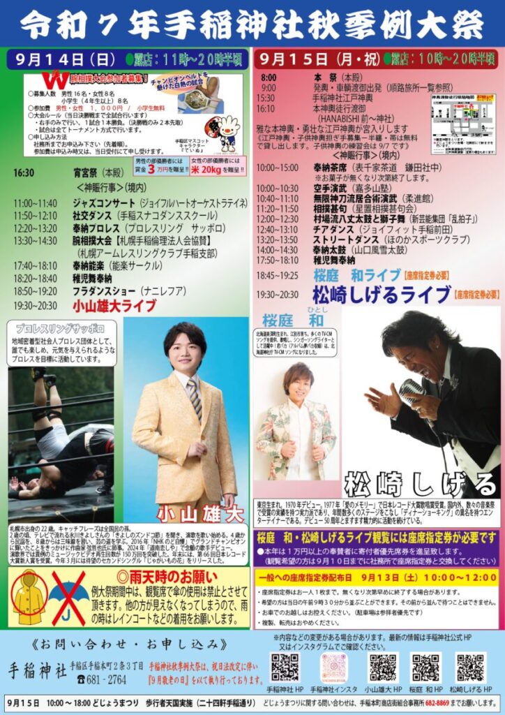 手稲神社では一年で最も重要な神事である例大祭の日を9月15日と定めていますが、毎年、週末や祝日(敬老の日)などに合わせてお祭りを行っています。今年2025年は9月14日と15日に行われる予定になっており、この2日間、手稲神社の境内には多くの屋台や露店が登場するほか、各種奉納演芸や余興も行われます。なお、一部の奉納行事の観覧には9月13日に配布される座席指定券が必要になります。